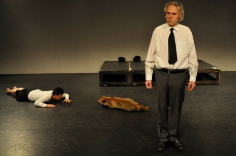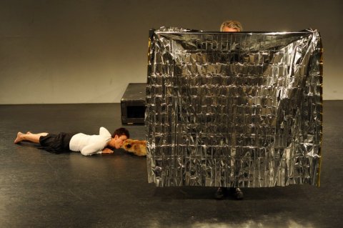 Regungslos stehen die beiden an gegenüberliegenden Flanken des Bühnenraumes, ertragen die spürbar verstreichende Zeit, bevor sie sich bedächtigen Schrittes auf ein zentral angeordnetes Podest bewegen. Statuen gleich, durch den Sockel zu einem eigentümlich entmenschlichten Kunstwerk erhoben, beginnen sie den Kampf: Über ihre Köpfe gestülpte Plastiktüten erzeugen Atemnot und beklemmende Enge.