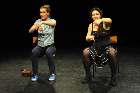 Beim Einlass sitzen die Performerinnen unprätentiös auf zwei schlichten Stühlen und stampfen, klatschen und schnipsen bereits, was das Zeug hält. Rhythmuslinien überlappen sich, laufen auseinander, treiben sich dynamisierend an, bremsen sich decrescendo aus, verebben. Ein Zweiwort-Mantra (mit leichter Überlänge) bringt sie in den richtigen 'Flow', sie finden ihren Sprachfluss, ihre Gesrpächsmelodie, nehmen in Haltung und Gesten eine fast wortlose Gesprächssituation auf, verlegene Solidaritätslacher und ratlose "Äh"-Arien inklusive.