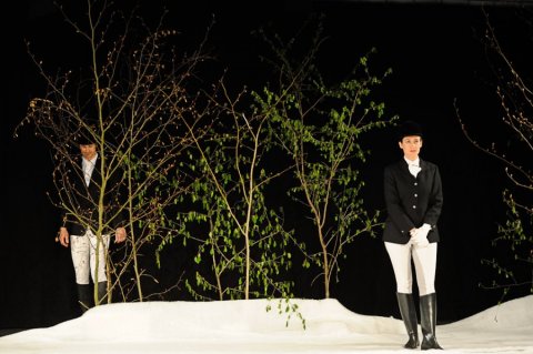 'Sehnsucht hinter Masken' evoziert Sehnsüchte und Maskeraden subtil indirekt in einer material sehr direkten Szenerie aus weißem Schaumstoffteppich, der von Birkenstämmchen umzäunt ist. Sylvia Lutz und Kim Willems im nobel schwarz-weißen Dress der Dressurreiter gehen hin und her, treten vor das Publikum und preisen sich und das, was sie am ATW gelernt haben, in unterschiedlicher Weise an. Sie deklamiert Bewerbungsschreiben und Danksagungen mit schüchternem, gewinnendem Lächeln. Er inszeniert sich mit Zitaten und Episoden in pseudo-spontanem Erzählton.
