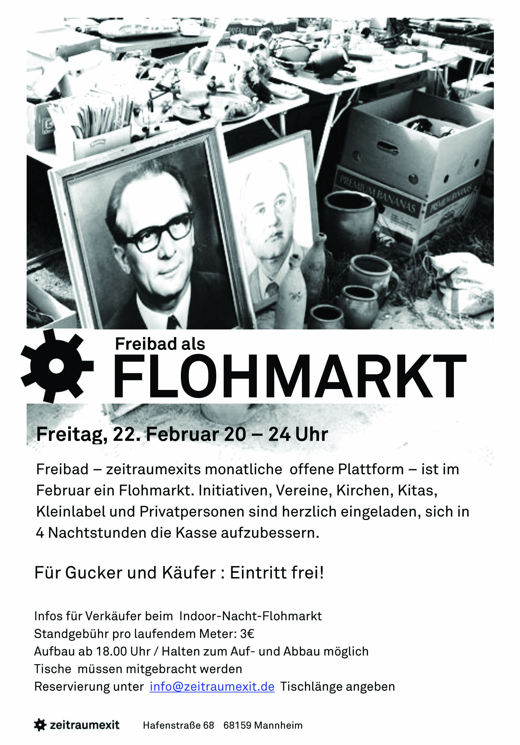 Wir freuen uns auf alle, die ihre Kasse aufbessern wollen. Schickt eure Anmeldung (mit Tischlänge in Metern, Standgebühr: 3€/lfd. Meter) bis 18. Februar an: info [at] zeitraumexit [dot] de oder informiert euch unter 0621-1227635.