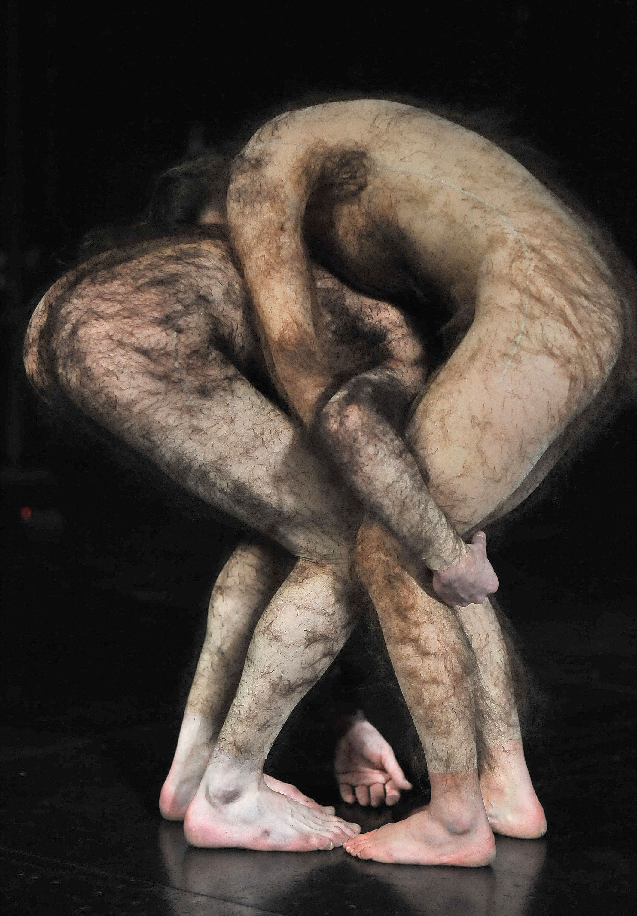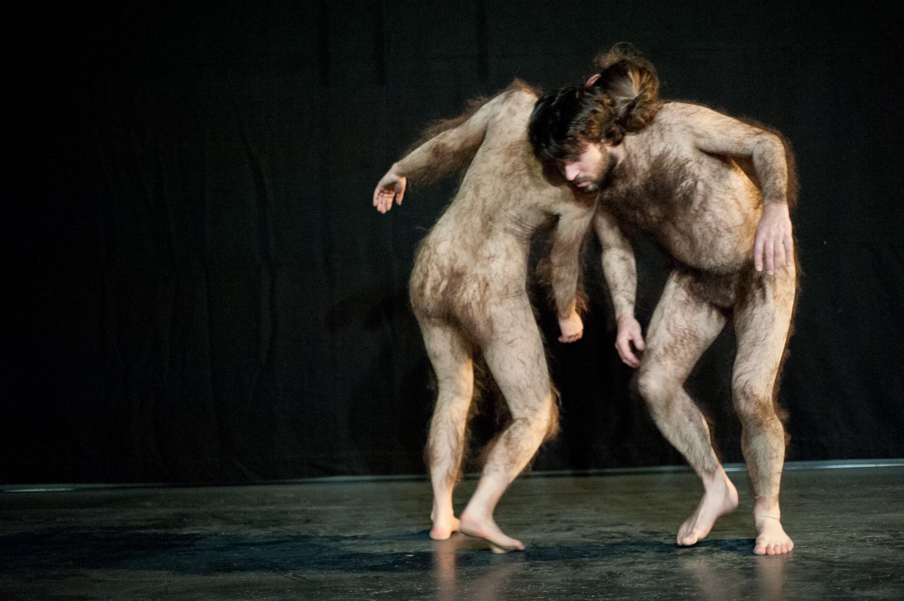 In »Halt mir einen Platz frei,bis ich anders wieder da bin« ergründen Angela Schubot und Martin Clausen als monströse Irrlichter, als Mischwesen aus Mann, Frau und Tier, die Möglichkeiten des Wandels und der Veränderung. Das Verschwinden und Verändern von Gefühlen, Körpern und Gedanken scheint an Übergängen zu wohnen. Beim Versuch, in dieses Dazwischen zu gelangen, zerlegen TWO FISH Sprache und Bewegung in ihre Einzelteile.