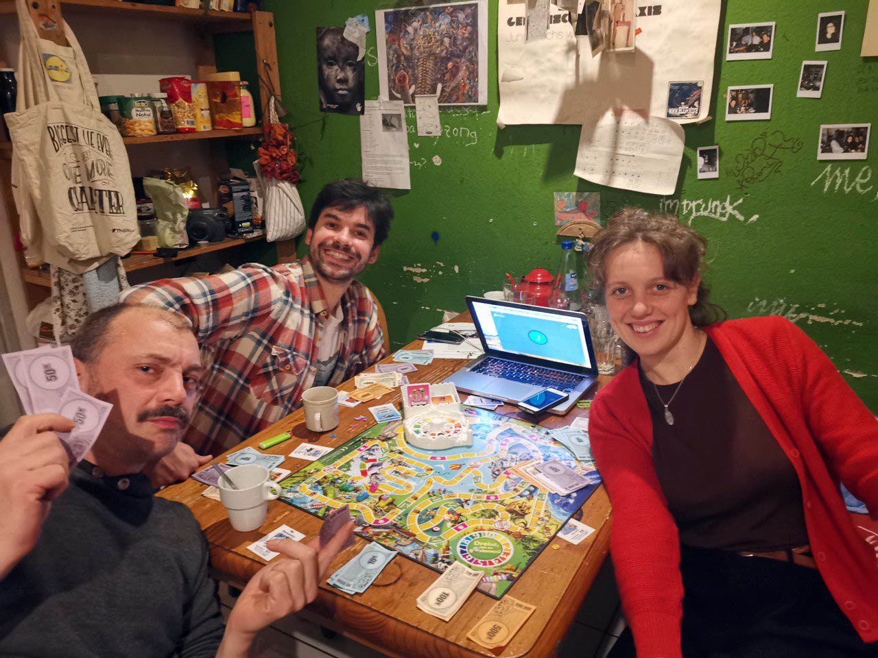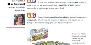 Seit zwei Jahren entwerfen Künstler*innen für zeitraumexit verschiedene Foyers, Räume, die zum Mitmachen und Verweilen einladen, die das Haus in den Stadtteil öffnen und die Straße ins Haus holen. Weil das Haus im Dezember und Januar aber pandemiebedingt geschlossen war, lud die Bildende Künstlerin Janet Grau Familien, Wohngemeinschaften, Einzelpersonen und Institutionen im Jungbusch ein, „Das Spiel des Lebens“ bei sich zuhause zu spielen und die Künstlerin online dazuzuschalten.