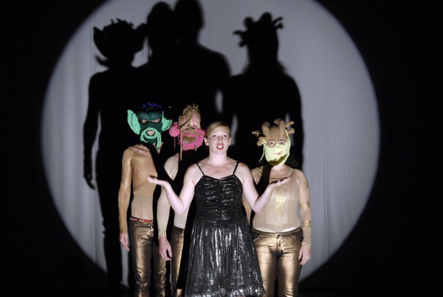 Nach der Aufnahmesession darf der Chor entspannen: Mit selbstgestrickten Masken auf dem Kopf treten die vier Performer zwischen die Plastik-Kulissen und erzählen die abenteuerliche Geschichte einer ganz normalen Frau, die die fiesesten aller Monster besiegt hat.