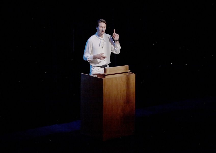 „Diese Angst, die jeder von uns kennt, liebes Publikum! Die Angst vor der Leere, die sich ab und zu in uns ankündigt und uns das Gefühl gibt, dass wir uns verlieren und uns nicht mehr richtig beisammen haben, nicht mehr Ganz zu sein. Genau diese Angst vor dieser Lücke. Und auch die Angst, das eigene Leben sei nichtig, bedeutungslos und eine völlig banale Nebenerscheinung im Universum bis zu unserem Tod. Über den hinaus doch etwas bleiben muss! Bestand haben muss! Dieser Moment, der irgendwann kommen wird, liebes Publikum. Und der uns mit einem Schlag all das nehmen wird, an dem wir so hart gearbeitet haben: Unserem Selbst! In das wir so viel investiert haben. Wir würden es verlieren, liebes Publikum! Gäbe es da nicht die Souveränen, die uns das Gefühl geben, es niemals verlieren zu können.“
